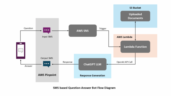 In response to these challenges, we developed an AI-driven SMS-based question-answering system, designed to facilitate instant, natural-language-based access to educational content. By harnessing the computational capabilities of AWS services, OpenAI’s ChatGPT, and intelligent document processing mechanisms, this solution provides contextual, real-time responses to inquiries, significantly enhancing knowledge acquisition. This architecture empowers users to engage with a sophisticated AI assistant, capable of processing and synthesizing vast amounts of information with remarkable efficiency.