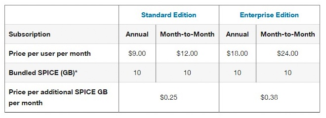 Amazon QuickSight has come up with an extremely competitive pricing structure (90% less as compared to other BI products). Its standard edition is priced at $9 per month per user and the enterprise edition is priced at as low as $18 per month per user (one year contractual basis).