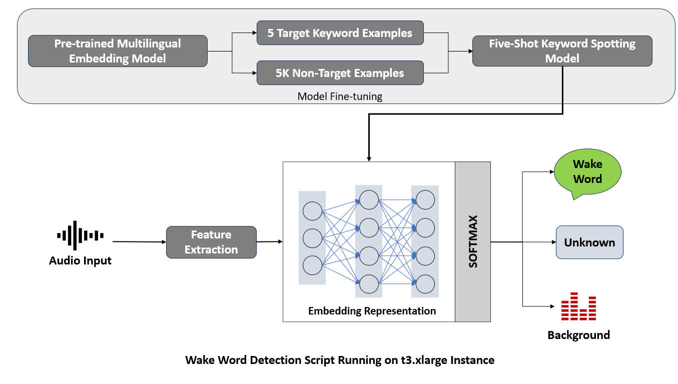 • Fine-tuned the model with only five custom target keyword samples and 5000 non-target examples to classify a custom target keyword irrespective of the language.