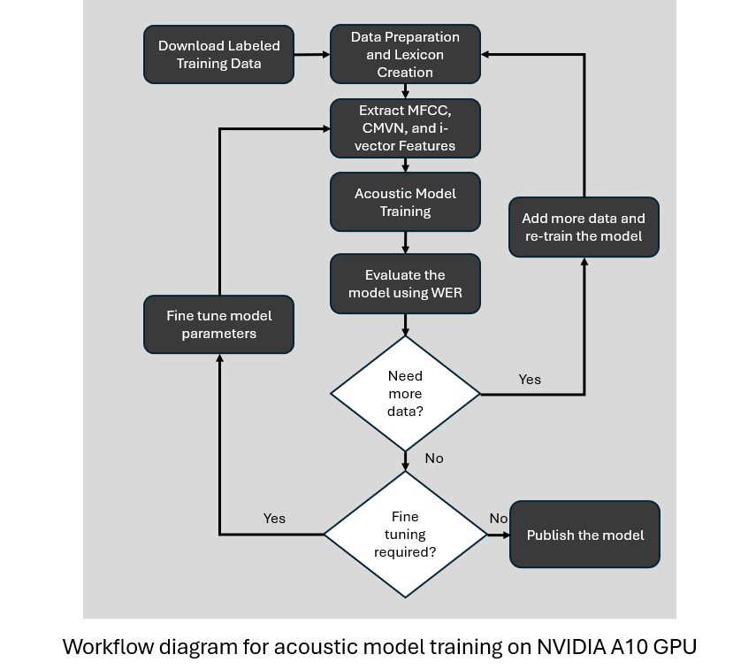 - The model is trained using TDNN (Time Delay Neural Network) on an NVIDIA A10 GPU instance for cost-effectiveness, parallel execution, and speed.